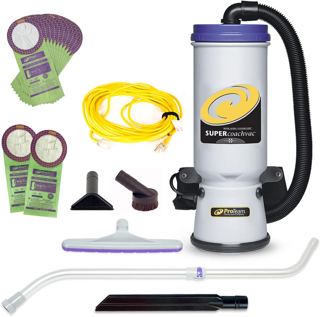 ProTeam Super CoachVac 107730. Commercial Backpack Vacuum Cleaner with HEPA Media Filtration. Telescoping Wand Tool Kit and 12 Extra Filter Bags. Gray